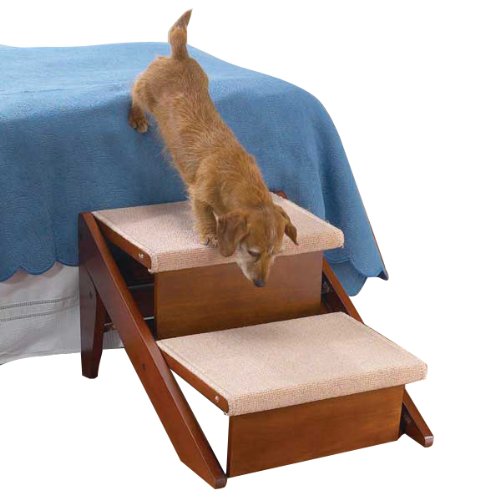 This ramp steps easily convert from steps to a ramp to make it easy for aging or arthritic pets to reach sofas, beds, and more. Easy to use staircase skittish pets who don't like traditional pet steps. Innovative patented design. Sturdy mahogany-finished pine frame holds pets up to 130-pounds. Each step measures 12-inch depth by 16-inch width and is covered with soft, non-slip, easy-clean carpeting. Perfect for aging or arthritic pets. Folds flat for storage. Handle and steps that lock in place increase portability. No assembly required. Measures 26-inch length by 13-inch height by 17-1/2-inch width.